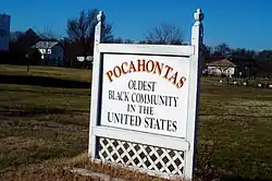In the 19th century, Pocohontas Island became a notable freedom colony.[4] the first predominately free black settlement in the state and, by mid-19th century, one of the largest in the nation (although enslaved people also lived on the island, and some free blacks owned slaves).[5] In 1860 slightly more than half of Petersburg's population was black, and 3,224 or one-third of those people were free; they constituted the largest free black population of the time. During the 20th century, the island's population declined as people moved north in the Great Migration. In 1975 residents secured renewed residential zoning to protect their neighborhoods from industrial development proposed by the city.[5]