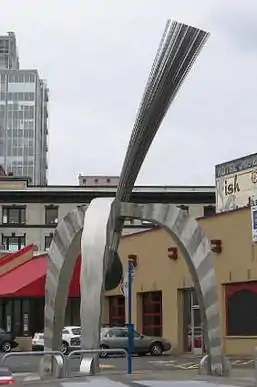 Pod is the name of a 2002 modern sculpture by American artist Pete Beeman,[1] currently installed at Southwest 10th Avenue and West Burnside Street in downtown Portland, Oregon. The 30-foot (9.1 m) sculpture, intended to represent the "infrastructure, energy, and vibrancy of Portland," is supported by its static tripod base with a 15-foot (4.6 m) diameter. It is constructed from stainless steel, galvanized steel, bronze, titanium, lead and other materials. Pod was fabricated by Beeman and David Bermudez, and engineered by Beeman and Peterson Structural Engineers. It is considered interactive and kinetic, with a central, vertical pendulum that swings back and forth when pushed. The sculpture cost as much as $50,000 and was funded by the Portland Streetcar Project. Pod is part of the City of Portland and Multnomah County Public Art Collection courtesy of the Regional Arts & Culture Council.[2]