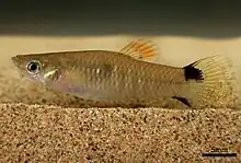Males do not exhibit bright color spots other than passing orange coloration in the throat region, which occurs more frequently in specimens from lagoon environments. Females are larger than males but the sexes do not otherwise difer as much as in the related common guppy, P. reticulata.[7]