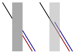 A straight black and red line is obscured by a grey rectangle. The blue line, rather than the red line, appears to be a continuation of the black one, which is clearly shown not to be the case on the second picture. Instead there is an apparent position shift of the lower portion of the line.[1]