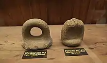 Poi is thought to have originated in the Marquesas Islands, created some time after initial settlement from Polynesian explorers.[5] While mashing food does occur in other parts of the Pacific, the method involved was more rudimentary. In western Polynesia, the cooked starch was mashed in a wooden bowl using a makeshift pounder out of either the stem of a coconut leaf or a hard, unripe breadfruit with several wooden pegs stuck into it. The origins of poi coincided with the development of basalt pounders in the Marquesas, which soon spread elsewhere in eastern Polynesia, with the exception of New Zealand and Easter Island.