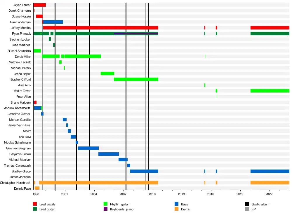 • Note that the Studio album and EP bars represent the release dates, not the recording dates; membership often changed between the two events.