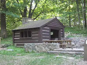 The Spring Shelter, so named because of the artesian spring nearby, was built by the Civilian Conservation Corps in 1937 during the Great Depression.