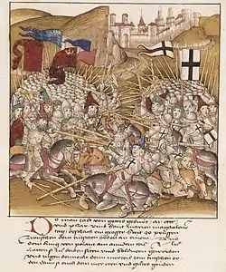 In the Baltic Sea region, the struggle of Poland and Lithuania with the Teutonic Knights continued and culminated at the Battle of Grunwald in 1410, where a combined Polish-Lithuanian army inflicted a decisive victory against them.[68] In 1466, after the Thirteen Years' War, king Casimir IV Jagiellon gave royal consent to the Peace of Thorn, which created the future Duchy of Prussia under Polish suzerainty and forced the Prussian rulers to pay tributes.[23] The Jagiellonian dynasty also established dynastic control over the kingdoms of Bohemia (1471 onwards) and Hungary.[69] In the south, Poland confronted the Ottoman Empire and the Crimean Tatars, and in the east helped Lithuania to combat Russia.[23]