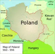 Poland began to form into a recognisable unitary and territorial entity around the middle of the 10th century under the Piast dynasty.[39] In 966, ruler of the Polans Mieszko I accepted Christianity under the auspices of the Roman Church with the Baptism of Poland.[40] In 968, a missionary bishopric was established in Poznań. An incipit titled Dagome iudex first defined Poland's geographical boundaries with its capital in Gniezno and affirmed that its monarchy was under the protection of the Apostolic See.[41] The country's early origins were described by Gallus Anonymus in Gesta principum Polonorum, the oldest Polish chronicle.[42] An important national event of the period was the martyrdom of Saint Adalbert, who was killed by Prussian pagans in 997 and whose remains were reputedly bought back for their weight in gold by Mieszko's successor, Bolesław I the Brave.[41]