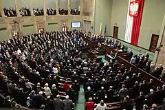 Poland was developing as a feudal state, with a predominantly agricultural economy and an increasingly powerful landed nobility that confined the population to private manorial farmsteads, or folwarks.[70] In 1493, John I Albert sanctioned the creation of a bicameral parliament composed of a lower house, the Sejm, and an upper house, the Senate.[71] The Nihil novi act adopted by the Polish General Sejm in 1505, transferred most of the legislative power from the monarch to the parliament, an event which marked the beginning of the period known as Golden Liberty, when the state was ruled by the seemingly free and equal Polish nobles.[72]