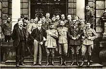 Due to the intervention of Archduke Wilhelm of Austria, who adopted a Ukrainian identity and considered himself a Ukrainian patriot, in October 1918 two regiments of mostly Ukrainian troops were garrisoned in Lemberg (modern Lviv).[18] As the Austro-Hungarian government collapsed, on October 18, 1918, the Ukrainian National Council (Rada), consisting of Ukrainian members of the Austrian parliament and regional Galician and Bukovynan diets as well as leaders of Ukrainian political parties, was formed. The council announced the intention to unite the West Ukrainian lands into a single state. As the Poles were taking their own steps to take over Lviv and Eastern Galicia, Captain Dmytro Vitovsky of the Sich Riflemen led the group of young Ukrainian officers in a decisive action and during the night of October 31 – November 1, the Ukrainian military units, consisting of 1,400 soldiers and 60 officers, took control over Lviv.[19] The West Ukrainian People's Republic was proclaimed on November 13, 1918, with Lviv as its capital.