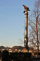 Standing just before the entrance to the castle is the Bar Column, designed by Zürich University Professor Julian Stadler. It had been erected by Count Plater, largely at his own expense, in 1868 (two years before the museum's opening) on the 100th anniversary of the founding of the Bar Confederation, to commemorate Poland's then-century-long struggle for independence. The column had originally been placed at the shore of Lake Zürich[7] but Russian protests had led to its move up to the castle, where it would not be visible from the town. The column is topped by an eagle, while the base bears, among other things, the Latin inscription, "Magna res libertas" ("A great thing is liberty") and the Polish–Lithuanian Commonwealth coat-of-arms featuring the Polish Eagle and the Lithuanian Vytis (in Polish, Pogoń).