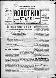 Polish Socialist Workers Party (Polish: Polska Socjalistyczna Partia Robotnicza, PSPR) was a political party in Czechoslovakia founded in February 1921, based amongst Polish workers. The party was active in trade union struggles, mainly mobilizing miners and workers in heavy industries. The chairman of the party was Emanuel Chobot. Other prominent members of the party were Antoni Steffek and Wiktor Sembol. The party closely cooperated with the Czechoslovak Social Democratic Party. The party published the newspaper Robotnik Śląski ('Silesian Worker') from Fryštát.[1][2][3]