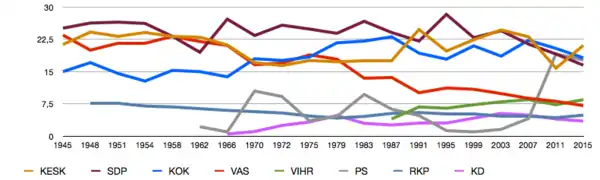 - ↑ "Suurimpien puolueiden kannatus eduskuntavaaleissa 1945 - 2003 (%)". tilastokeskus.fi (in Finnish). Retrieved 8 January 2021.