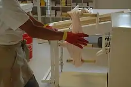 Part of making the polkagris involves stretching the heated sugar before the red stripe is added and the candy is rolled and cut