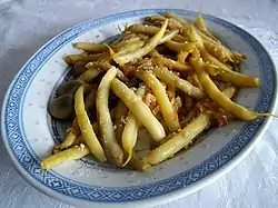Polonaise sauce (French: sauce à la polonaise) is a sauce that originated in Poland and became popular in France in the 18th century.[1] The sauce consists of melted butter, chopped boiled eggs, bread crumbs, salt, lemon juice and herbs such as thyme, basil and parsley. It is poured over cooked or steamed vegetables, most notably cauliflower, asparagus, wax beans or broccoli.[2][3][4][5] Velouté à la polonaise is a wholly different sauce.