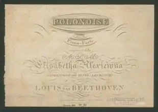 The Polonaise in C major, Op. 89, by Ludwig van Beethoven is a polonaise for solo piano, published in 1815. He composed it in December 1814, at a time when the polonaise was becoming a popular dance and class marker among the European nobility.[1] Beethoven was presented as a prominent artist at the ongoing Congress of Vienna,[2] where he met the visiting Russian Empress Elizabeth Alexeievna. He dedicated the polonaise to the Empress, and was compensated with a sum of 50 ducats.[3] The piece is Beethoven's first and only published standalone polonaise, and is notable as a precursor to Chopin's more well-known polonaises.[4]