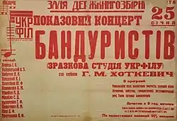 The Poltava Bandurist Capella was vocal-instrumental ensemble who accompanied themselves on the multi-stringed Ukrainian bandura. It was initially established in February 1925, based on a male church choir who sang in the Ukrainian Autocephalous Orthodox Cathedral in Poltava under the direction of Fedir (Khvedir) Popadych. The ensemble was disbanded in October 1934.
