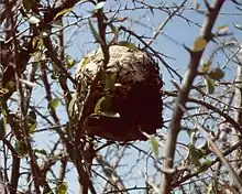 Workers build enclosed, multitiered, roughly spherical nests of carton paper maché-like pulp of plant fibres chewed with saliva.[1] Nests are reddish-brown in color, and are not very large.[2] They are typically built between 2 and 5 m off the ground,[7] in the branches of trees or shrubs.[1]