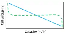 Conductive polymers can be n-doped or p-doped to form an electrochemically active material with conductivity due to dopant ions on a conjugated polymer backbone.[9][2] Conductive polymers (i.e. conjugated polymers) are embedded with the redox active group, as opposed to having pendant groups, with the exception of sulfur conductive polymers.[2] They are ideal electrode materials due to their conductivity and redox activity, therefore not requiring large quantities of inactive conductive fillers.[10] However they also tend to have low coulombic efficiency and exhibit poor cyclability and self-discharge.[7] Due to the poor electronic separation of the polymer's charged centers, the redox potentials of conjugated polymers change upon charge and discharge due to a dependence on the dopant levels. As a result of this complication, the discharge profile (cell voltage vs. capacity) of conductive polymer batteries has a sloped curve.[3]