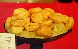 Pommes soufflées are a variety of French fried potato. Slices of potato are fried twice, once at 150 °C (302 °F) and a second time after being cooled, at 190 °C (374 °F). The potato slices puff up into little pillows during the second frying and turn golden brown.