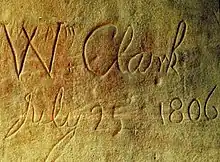 The inscription consists of his signature and the date, July 25, 1806.[3] Clark wrote that he climbed the sandstone pillar and "had a most extensive view in every direction on the Northerly Side of the river". He named the outcropping after Jean Baptiste Charbonneau—the son of expedition member Sacagawea—whom he nicknamed "Pompey". His original name for it was "Pompey's Tower"; it was changed to the current title in 1814.