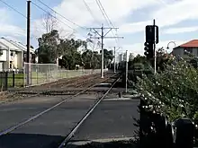 Looking towards Port Melbourne from the Swallow Street level crossing, the railway signals have been removed and have been replaced with signals resembling traffic signals for the trams