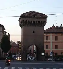 First erected in the second half of the 13th century, and rebuilt in the 15th century. The now isolated tower once was a machiocolated rampart in the city walls. The gate once stood beside the Savena Canal, which crossed the city and whose current fed hydraulic power to the city's cloth factories.[1] 44°29′08″N 11°20′54″E / 44.48556°N 11.34833°E / 44.48556; 11.34833