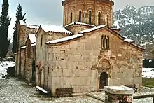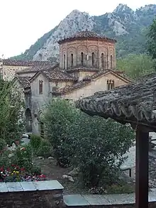 The church is composed of the main church and the later exonarthex. The main church is a three-aisled basilica with a cross roof formed by a vertical transept in the main aisle. The side-aisles are considerably lower and are separated from the central aisle by columns supporting six arches. To the east the church features three three-sided apses.[1][3] The walls of the church to the height of 2 m are built of large limestone ashlar blocks, some of which have been arranged to form crosses, while the remainder was built in the typically Byzantine enclosed brick system (square stones with bricks around). The external walls feature ceramic decorations in the form of jagged bands, meanders, crosses, etc. The windows are double- or triple-arched, and feature ceramic decorations.[1] The exonarthex, which was added in the late 14th century, is of the cross-in-square type, with four small corner niches. The structure was largely built with reused material.[1][3] The monastery's founder, John Doukas, was buried before the south wall of the church; a fresco above his tomb shows him "as a monk being presented by an angel to the enthroned Virgin".[6]