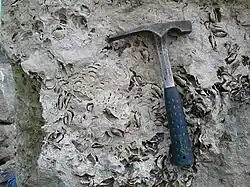 Portland Admiralty Roach is a kind of stone from the Isle of Portland used to construct "The Cobb", the well-known seawall at Lyme Regis in Dorset. The stone is rich in fossils (known as shells to local masons) often consisting of almost fifty percent fossilized remains with an average size of approximately 35 mm. The stone, which was quarried by Albion Stone, has a maximum bed height of 2 metres. The stone is renowned for being highly frost resistant and being able to withstand the chemical effects of seawater. The stone is an open textured oolitic limestone from the Portlandian formation formed during the Tithonian age, (152.1 ± 4 Ma to 145.0 ± 4 Ma (million years ago)) of the Late Jurassic epoch. It is formed from ooliths in a micrite (fine grained calcium carbonate) matrix. There are many voids in the stone, caused by percolating rainwater dissolving all or parts of its many shell fossils, mainly bivalves and gastropods.