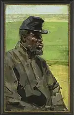 The sitter was identified in 2000 by Eveline Sint Nicolaas as Kees Pop, an African soldier of the Dutch East Indies Army (Koninklijk Nederlands Indisch Leger; "KNIL"). Such men were recruited during the period 1831–1872 as Zwarte Hollanders in Elmina and given names that were pronounceable for their military superiors.[1][2] ‘Pop’ was possibly from Elmina, but could have been born as far north as Burkina Faso or as far East as Nigeria. He served 12 years in the Aceh War. Under his mitella the medals for the Expedition Cross and the Aceh Medal can be seen. His comrade Jan Kooi was portrayed in the same year by J.C. Leich in a much more heroic, realistic military fashion, whereas Israels was much more interested in the drama of the sitter's personal story. This portrait shows the effects of a long military career in a foreign country surrounded by African comrades who themselves spoke different languages, answering to a name from a foreign language. Israëls had a fascination for the Dutch East Indies, possibly fostered by his friendship with the Dutch painter Johannes Evert Hendrik Akkeringa, who was of mixed Indonesian heritage. Though the first World War caused him to delay, Israëls did manage to visit the Dutch East Indies himself, where he made many paintings during the course of a two-year stay in 1921, armed with introductory letters from Akkeringa.