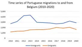 In fact, since 2010 around 18,100 Portuguese have left Belgium. The emigration of Portuguese citizens has been constantly increasing since the first available year of the time series (2010). It is worth noting that, starting from 2014, the Portuguese unemployment rate has steadily fallen and the economic outlook has bettered. The sole exception occurred in 2020, during which a decline in the influx of Portuguese individuals was observed. This decline is most likely attributable to the Coronavirus pandemic.[53][54] Similarly, the influx of Portuguese migrants has steadily decreased since 2013, with the exception of 2019.