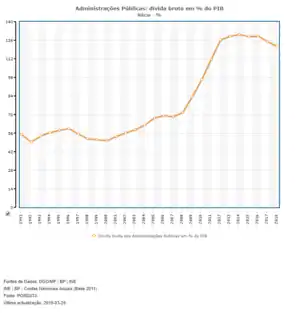 The Portuguese national debt, the public debt of Portugal, or the debt of the public administrations of Portugal, as any other government debt, is the financial amount the Portuguese State owes, externally and internally, due to its various financial commitments.[1]