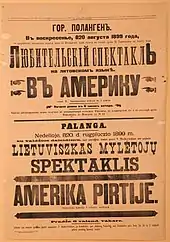In spring 1899, Višinkis returned to Lithuania. He first visited Šiauliai where he met members of the intelligentsia and developed a friendship with Augustinas Janulaitis, at the time law student at the University of Moscow.[76] He then went on to visit Petkevičaitė-Bitė who recruited him to organize the first Lithuanian-language theater performance in Palanga, which was part of the Courland Governorate where anti-Lithuanian Russification policies were less strictly enforced.[77] Therefore, Liudas Vaineikis was able to obtain an official permit for the performance.[78] They settled on a comedy America in the Bathhouse (Amerika pirtyje), which required only nine actors and simple props and was already performed in Saint Petersburg and thus had been approved by the state censors.[79] Višinkis played Vincas, the main villain, who conned the naive Agota, played by Stanislava Jakševičiūtė, who dreamed of immigration to America.[80] Other actors included Jadvyga Juškytė and Augustinas Janulaitis.[81] The performance on 8 August 1899 was a critical and commercial success.[82] After the performance, Vaineikis took Višinskis and Avižonis to Tilsit in East Prussia, the major publishing center of the illegal Lithuanian press.[83] On their way back, they visited Juozas Tumas-Vaižgantas in Kuliai and Sofija Pšibiliauskienė near Tryškiai.[84]