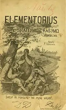 Višinskis remained in Vilnius and began organizing Šviesa, a publishing company aimed at publishing the works of Lithuanian writers. The company was established in February 1905.[128] By late spring it had 20 shareholders that each contributed 50–100 rubles.[129] The first published work was a book on Switzerland by Kazys Grinius.[130] Other books included a work on Japan by Steponas Kairys, a translated work on Bulgaria, in addition to literary works by Lithuanian writers, including debut comedy of Jurgis Smolskis.[131] At the same time, he wrote educational texts explaining basic concepts of a democracy (constitution, parliament, or universal suffrage).[132] Using his teaching experience, he wrote an original primer to teach children to read. It was illustrated and featured excerpts from Lithuanian writers, samples of Lithuanian folklore, and omitted any Catholic prayers.[133] It was very popular and was reprinted six times. It introduced the analyticalsynthetic phonics method, developed in Russia by Konstantin Ushinsky and still used in schools today, instead of the old method of rote memorization of syllable by syllable (Lithuanian: slebizavimas).[134] Višinkis published two other primers – an abbreviated version of the first primer and a version aimed at teaching to write.[134] He wanted to publish many other works, but the work was slow – each publication needed to be approved by the state censors and then published at the Zawadzki press.[135] Therefore, he continued to edit Varpas and publish stand-alone works in East Prussia.[132] In Vilnius he collaborated with Felicija Bortkevičienė (both worked on Žiburėlis) and Jonas Jablonskis (he lived across the street), worked with Sofija Pšibiliauskienė to improve her writing.[136] At Šviesa, he was assisted by Juozas Paršaitis.[130]