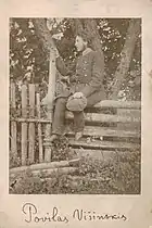 In summer 1891, manor owners in Užventis invited Višinskis to tutor their children, including Marija Pečkauskaitė who later became known as Šatrijos Ragana.[12] She borrowed the pen name from one of Višinskis' letters where he called her ragana (witch).[13] Višinskis introduced Pečkauskaitė to the Lithuanian National Revival, Narodnik ideas, and encouraged her to write the first poems and short stories. They developed a friendship and feelings that grew into tender love.[14] From 1891, Višinskis worked as a tutor and supervisor of a student dormitory managing to pay the school tuition on his own.[15] In 1894, Višinskis graduated from the gymnasium, but refused to follow his parents' wishes to study at the Kaunas Priest Seminary. Instead, he decided to study biology at the Saint Petersburg University. Angered and disappointed, his parents refused to support him financially.[16]