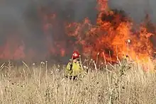 Fire is a big component to the success of grasslands, large or small as it is a fire dependent ecosystem.[42] Controlled burns, with a permit, are recommended every 4–8 years (after two growth seasons) to burn away dead plants; prevent certain other plants from encroaching (such as trees) and release and recycling nutrients into the ground to encourage new growth.[8][7] A much more wildlife habitat friendly alternative to burning every 4–8 years is to burn 1/4 to 1/8 of a tract every year.[43][44] This will leave wildlife a home every year and still accomplish the task of burning. The Native Americans may also have used the burns to control pests such as ticks.[45] These prescribed burn motivate grasses to grow taller, produce more seed, and flower more abundantly.[7] If controlled burns are not possible, rotational mowing is recommended as a substitute.[46]