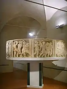 • the parapet of the external pulpit of the cathedral (1434-1438), made by Donatello and his school. Because of the degradation suffered during their five centuries outside, the reliefs were removed from the pulpit in 1967 and were substituted with replicas. A laborious restoration and cleaning (finished in 1999) directed by the Opificio delle pietre dure of Florence recreated a more unified and legible work. The imposing parapet takes the form of a small round temple with double pilasters that divide it into seven carved sections, each displaying a group of dancing figures which seem to move with joyous and vivacious steps.