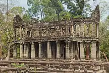 Preah Khan (Khmer: ប្រាសាទព្រះខ័ន; "Royal Sword") is a temple at Angkor, Cambodia, built in the 12th century for King Jayavarman VII to honor his father.[1]:383–384,389[2]:174–176 It is located northeast of Angkor Thom and just west of the Jayatataka baray, with which it was associated. It was the centre of a substantial organisation, with almost 100,000 officials and servants. The temple is flat in design, with a basic plan of successive rectangular galleries around a Buddhist sanctuary complicated by Hindu satellite temples and numerous later additions. Like the nearby Ta Prohm, Preah Khan has been left largely unrestored, with numerous trees and other vegetation growing among the ruins.