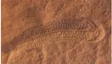 The Ediacaran fossils of Southern Australia contain trace fossils, which indicate that there were motile benthic organisms. The organisms that produced the traces in the sediments were all worm-like sediment feeders or detritus feeders (Detritivore). There are a few trace fossils, which resemble arthropod trails. Evidence suggests that arthropod-like organisms existed during the Precambrian. This evidence is in the type of trails left behind; specifically one specimen that shows six pairs of symmetrically placed impressions, which resemble trilobite walking trails.[7]
