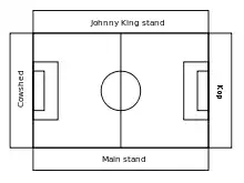 The Main Stand is the oldest in Prenton Park, having been opened in December 1968.[3] It is also the largest, with a capacity of 5,957.[4] A two tier stand, it is generally divided into three main sections. The lower tier consists of the Bebington End paddock (capacity 1,150) and the Town End paddock (capacity 1,209), either side of the halfway line. The upper tier is simply referred to as the Main Stand (capacity 3,598).