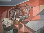 The mural is divided into three parts: a flat, central panel measuring 20 by 6 meters, and two sides panels set off at oblique angles to the central part. Each panel measures 7.6 by 6 meters. The mural as a whole is 211.2 m².[3] In addition to this, the mural makes use of a staircase with right angles leading up to a second-story art gallery, increasing the total area to 300 m².