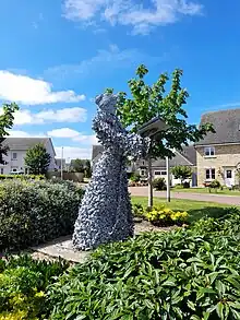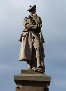A war memorial, which commemorates the lives of local service personnel who died in the First World War, Second World War and the Spanish Civil War, stands near the town centre but is slightly obscured by the flanking buildings. It takes the form of a Scottish soldier in a Tam o' Shanter bonnet and greatcoat sculpted by William Birnie Rhind in 1921.[8]