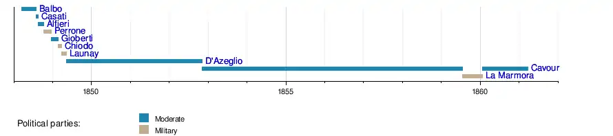 3 years, 168 days | Moderate Party | D'Azeglio I | Moderate • Military | IV (Dec 1849) |