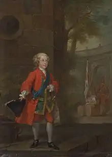 From childhood, he showed physical courage and ability, and became his parents' favourite.[13] He was enrolled in the 2nd Foot Guards and made a Knight of the Bath, when aged four.[14] He was intended, by the King and Queen, for the office of Lord High Admiral, and, in 1740, he sailed, as a volunteer, in the fleet under the command of Sir John Norris, but he quickly became dissatisfied with the Navy,[15] and, instead secured the post of colonel of the First Regiment of Foot Guards on 20 February 1741.[16]