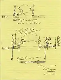 Prince of Persia was programmed in 6502 assembly, a low-level programming language.[10] Mechner used an animation technique called rotoscoping, with which he used footage to animate the characters' sprites and movements. To create the protagonist's platforming motions, Mechner traced video footage of his younger brother running and jumping in white clothes.[11] To create the game's sword fighting sprites, Mechner rotoscoped the final duel scene between Errol Flynn and Basil Rathbone in the 1938 film The Adventures of Robin Hood.[9] Though the use of rotoscoping was regarded as a pioneering move, Mechner later recalled that "when we made that decision with Prince of Persia, I wasn't thinking about being cutting edge—we did it essentially because I'm not that good at drawing or animation, and it was the only way I could think of to get lifelike movement".[12] Also unusual was the method of combat: protagonist and enemies fought with swords, not projectile weapons, as was the case in most contemporary games. Mechner has said that when he started programming, the first ten minutes of the film Raiders of the Lost Ark had been one of the main inspirations for the character's acrobatic responses in a dangerous environment.[13]