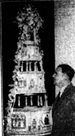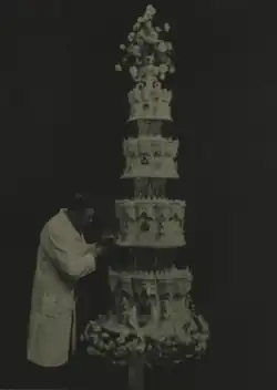This three-tiered cake, mounted on a silver stand was made by F E Jacobs, chief decorator of J Lyons’ Ornamental Department. It stood 1.8 metres high and weighed 63 kg.[20]