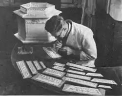 Jack Bryant preparing decorative panels for the Huntley and Palmer wedding cake, from a 1947 newspaper