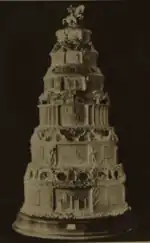 Details of the cake design were kept secret, with the Princess wishing that they “not be made known until the wedding day”.[32] However, the cake was put on private view for select visitors in their London factory on 15 November, where invited guests watched Frederick E Schur, the company's chief confectioner, put final touches to the decoration.[33] The day before the wedding, the cake was delivered to Buckingham Palace in a pantechnicon, escorted by a “courtesy cop” together with six men inside the van.[34]
