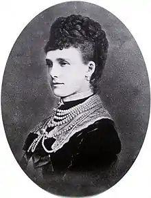 Princess Eugenia of Leuchtenberg was born on 1 April [O.S. 20 March] 1845 at the Mariinskiy Palace in Saint Petersburg.[3] She was the fourth child and third daughter of Maximilian de Beauharnais, 3rd Duke of Leuchtenberg and his wife, Grand Duchess Maria Nikolaevna of Russia. Eugenia's father, Maximilian, Duke of Leuchtenberg, had traveled to St. Petersburg, eventually winning the hand of Grand Duchess Maria Nikolaevna, Nicholas I's eldest daughter. Maximilian was subsequently bestowed with the style Imperial Highness and given the title Prince Romanowsky.[4] As the daughter of a Russian grand duchess and an ennobled Russian prince, Eugenia and her siblings were always treated as grand dukes and duchesses, bearing the styles Imperial Highness.[5][6][7]