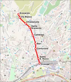 The Principe–Granarolo rack railway (Italian: Ferrovia Principe-Granarolo) is a rack railway in the Italian city of Genoa that connects via del Lagaccio, near the Genoa Piazza Principe railway station, to the Granarolo hills. The line is sometimes erroneously described as a funicular and listed alongside the city's Zecca–Righi funicular, the Sant'Anna funicular and the Quezzi funicular. The line is managed by AMT Genova, which manages the city's public transport.[1][2]
