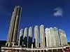 There is currently some controversy over the "wall effect" (Chinese: 屏風樓, literally "folding screen building") caused by uniform high-rise developments which adversely impact air circulation, leading to an aggravation of the heat effect while also impact public hygiene and contribute to air pollution.[2] Private developers seeking to maximise revenues have tended to build uniform blocks on seafront sites to give all units unrestricted sea view.