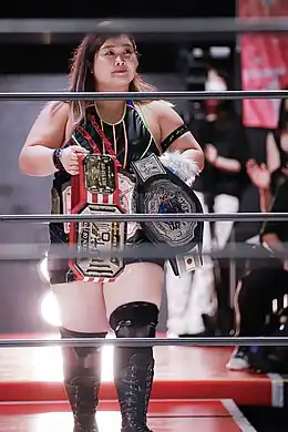 ![]() Yuu holding the title belt in her right hand | |||||||||||||||||||
