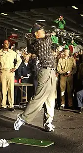 Woods giving a driving demonstration aboard the USS George Washington.